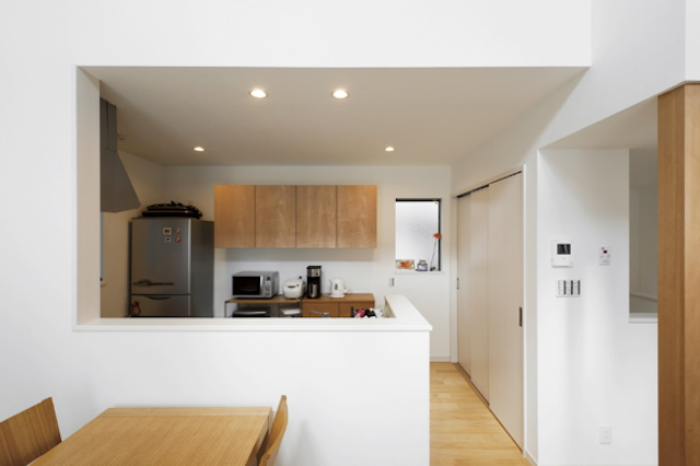 木目の吊り戸は、高すぎて奥まで使えないという現象が起こらないように、高さを下げました。全面に吊り戸がないことで、広さの演出もできています。