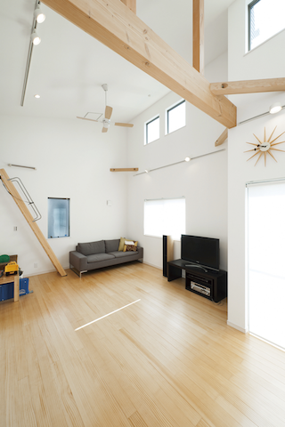 今回ご紹介するのは、勾配天井リビングの開放的な家。