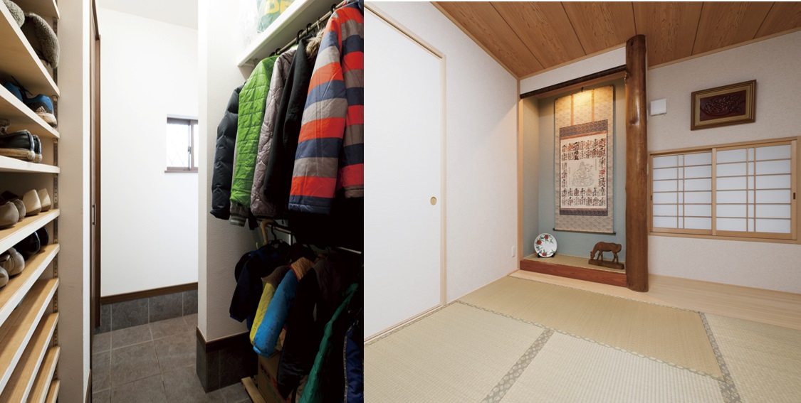 (左)子世帯専用のシューズクローゼット。子供たちの靴で煩雑になりがちな玄関ですが、親世帯に迷惑をかけることなく使うことができます。